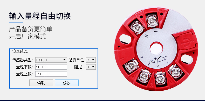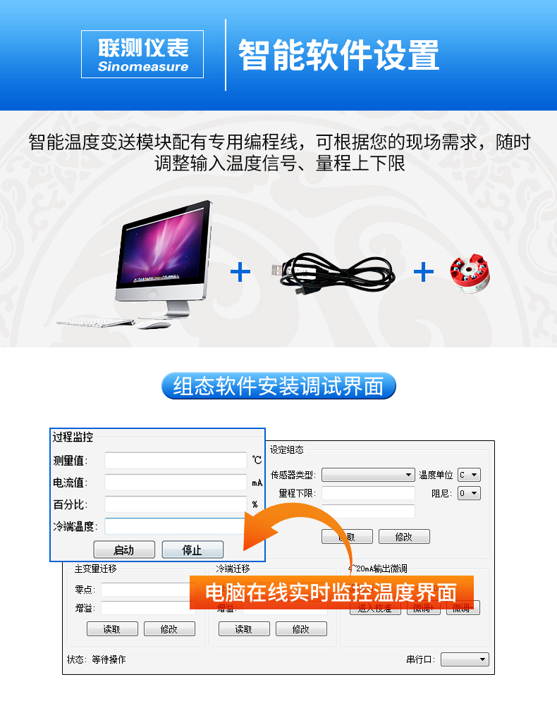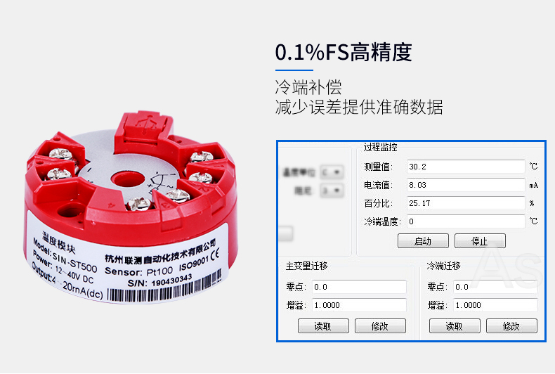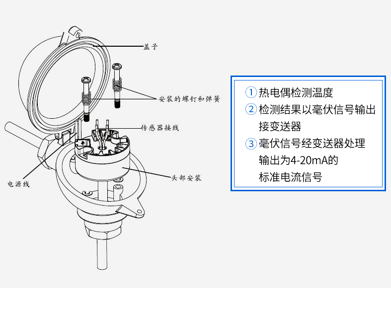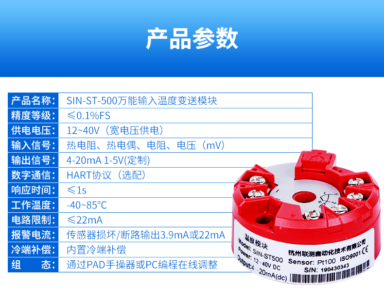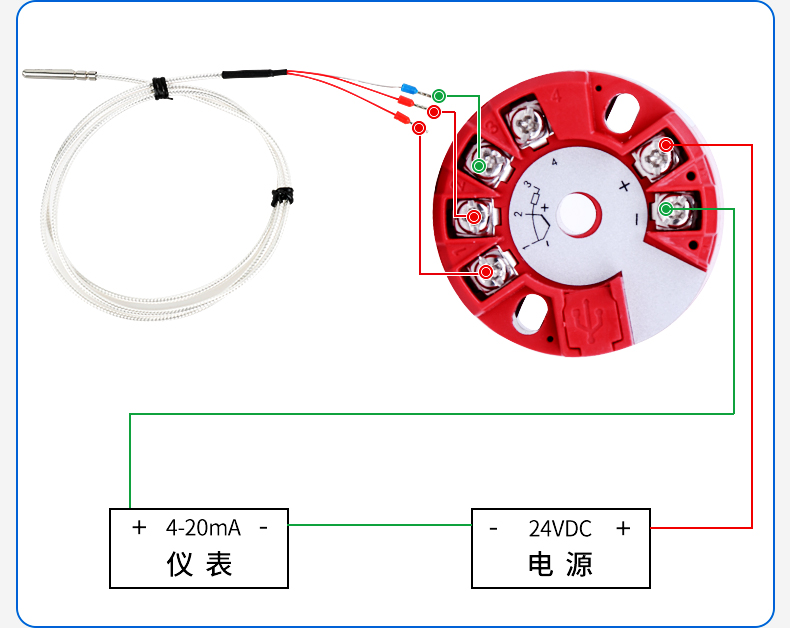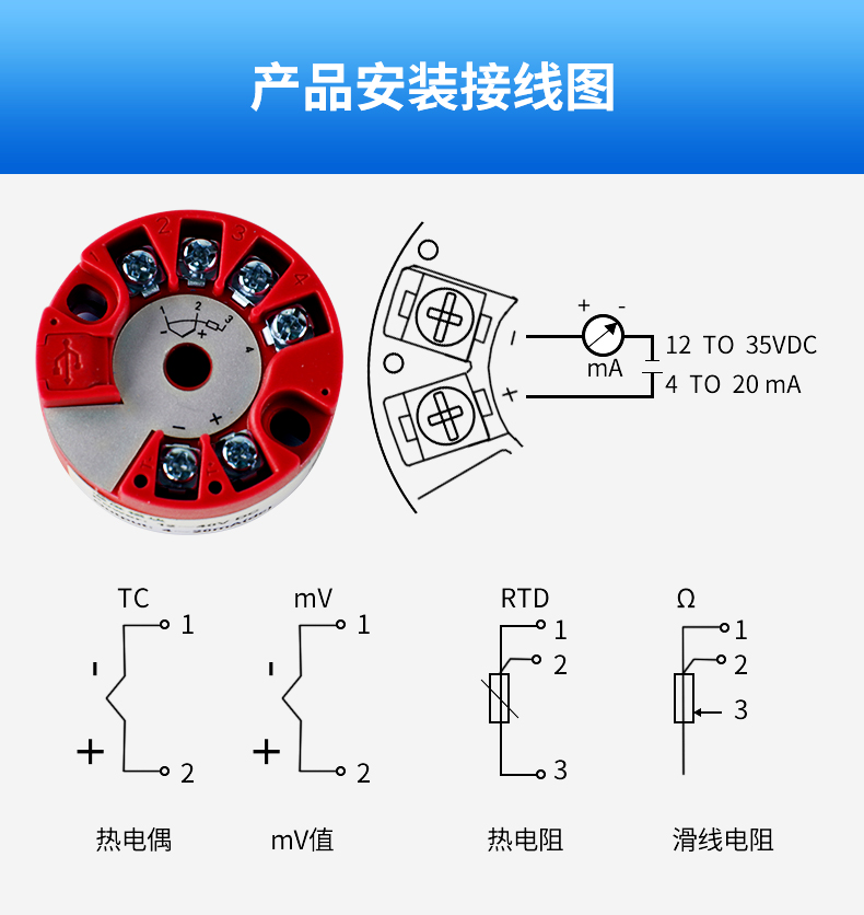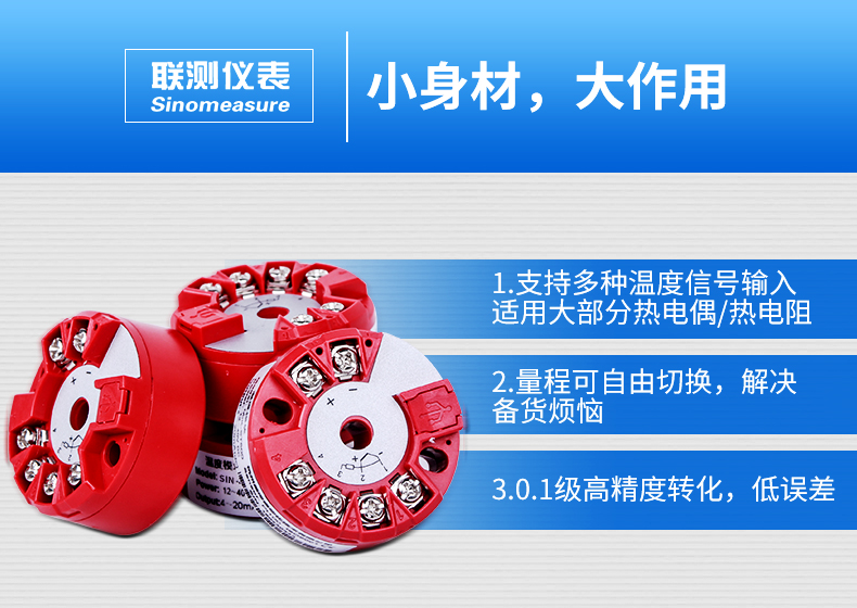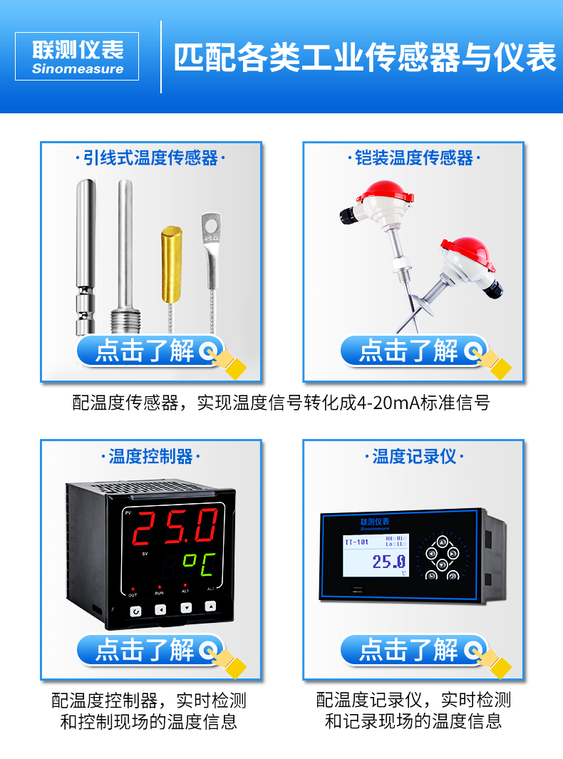 溫度變送器采用熱電偶、熱電阻作為測(cè)溫元件,從測(cè)溫元件輸出信號(hào)送到變送器模塊,經(jīng)過(guò)穩(wěn)壓濾波、運(yùn)算放大、非線性校正、V/I轉(zhuǎn)換、恒流及反向保護(hù)等電路處理后,轉(zhuǎn)換成與溫度成線性關(guān)系的4~20mA電流信號(hào)0-5V/0-10V電壓信號(hào),RS485數(shù)字信號(hào)輸出。