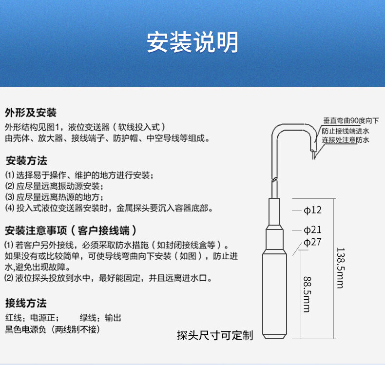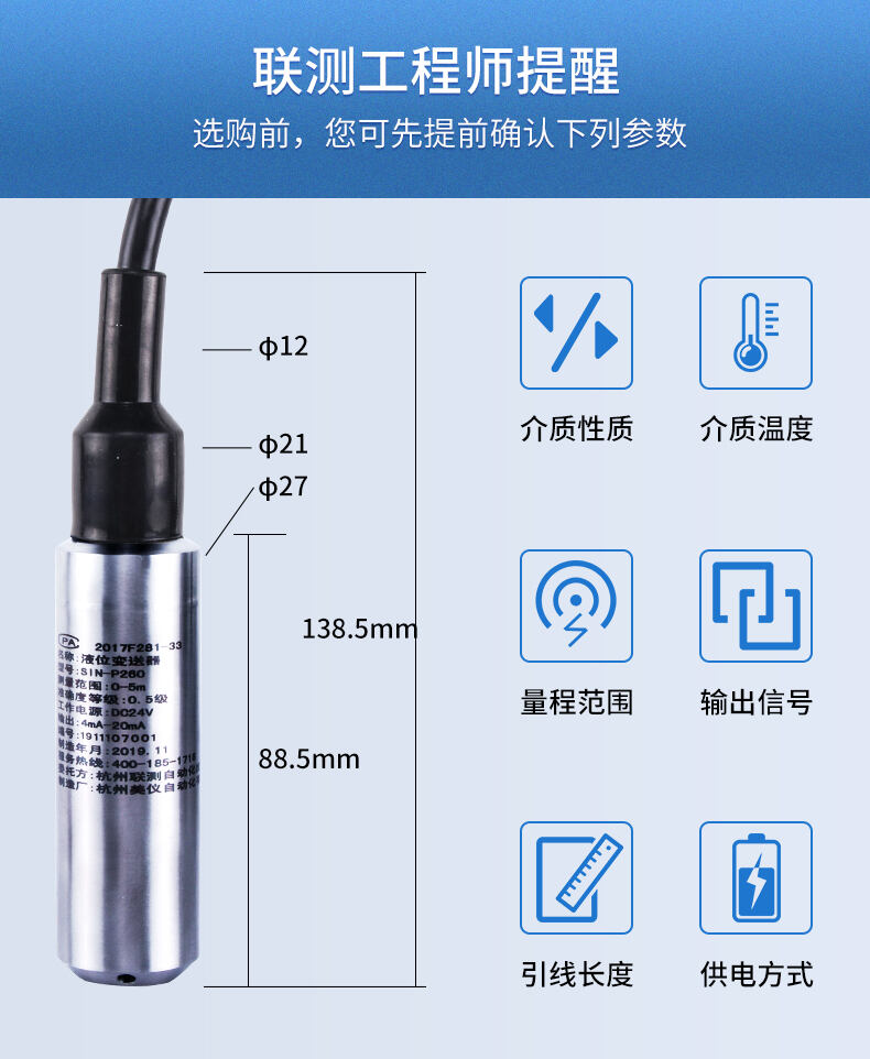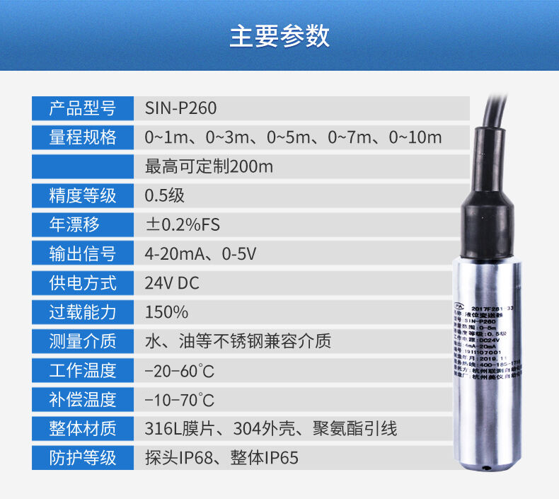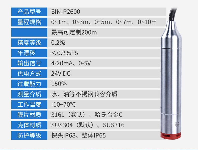 SIN-P260/P2600投入式液位變送器由高性能擴(kuò)散硅壓阻式壓力傳感器作為測(cè)量元件,把與液位深度成正比的液體靜壓力準(zhǔn)確測(cè)量出來(lái),并經(jīng)過(guò)信號(hào)調(diào)理電路轉(zhuǎn)換成標(biāo)準(zhǔn)(電流或電壓)信號(hào)輸出,建立起輸出信號(hào)與液體深度的線性對(duì)應(yīng)關(guān)系,實(shí)現(xiàn)對(duì)液體深度的測(cè)量。